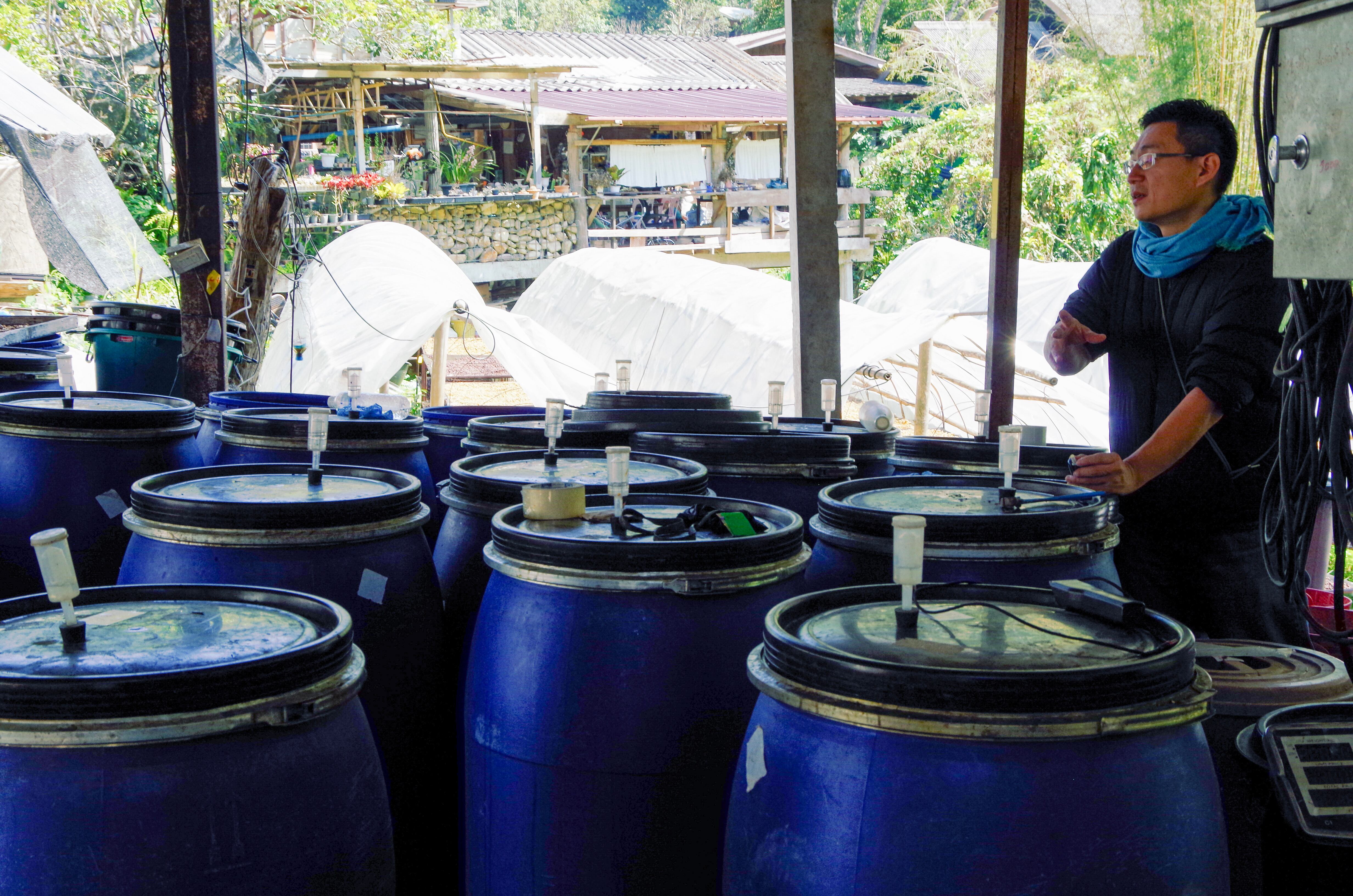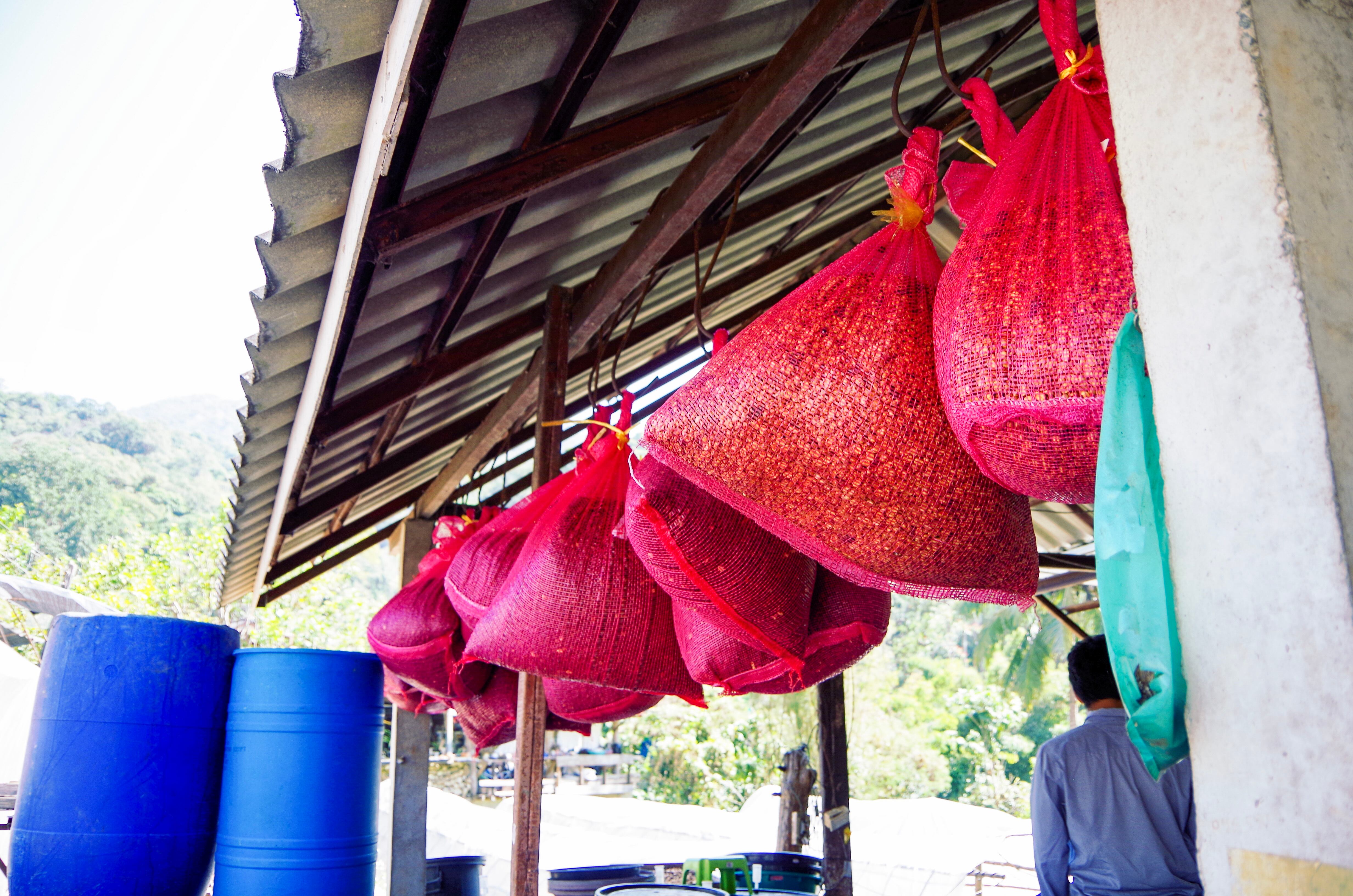 元システムエンジニアのNuiさんと元公認会計士をしていたAoiさんは、9年前ほど前にバンコクから実家の農園を継ぐために戻ってきて、クリーンで味わいの深いコーヒー豆の可能性を探っています。おふたりはともに30代と若く、品質を突き詰めていく様子から今後が非常に楽しみな生産者です。お父さんの代から農園を継いでおり、広さは約25haととても大きい。40年前のロイヤルプロジェクトにより、ケシ栽培からコーヒー栽培に切り替えた。標高は1,000mほどで、アグロフォレストリー。シェードがあり、農園はとても涼しい。川を渡ってかなりの急こう配を登る。土は冷たい方がいい木が育つとされており、ひんやりしてフカフカでした。チェリーを密閉したタンクに入れて、3日間嫌気性発酵し、その後果肉除去してポリタンクに戻し、追加で72時間嫌気性発酵(ダブルアナエロビック)させた加工のダブルアナエロビックウォッシュ。