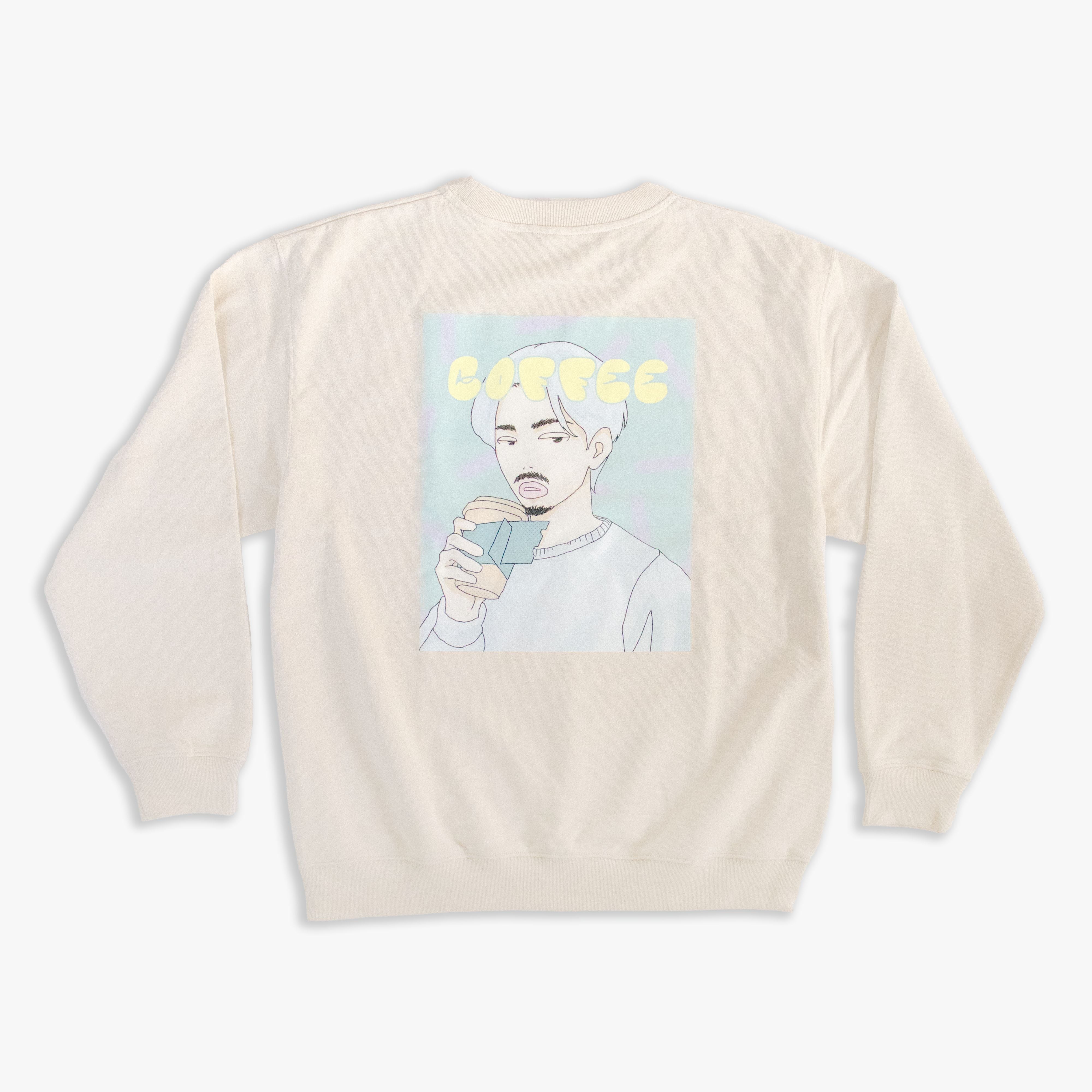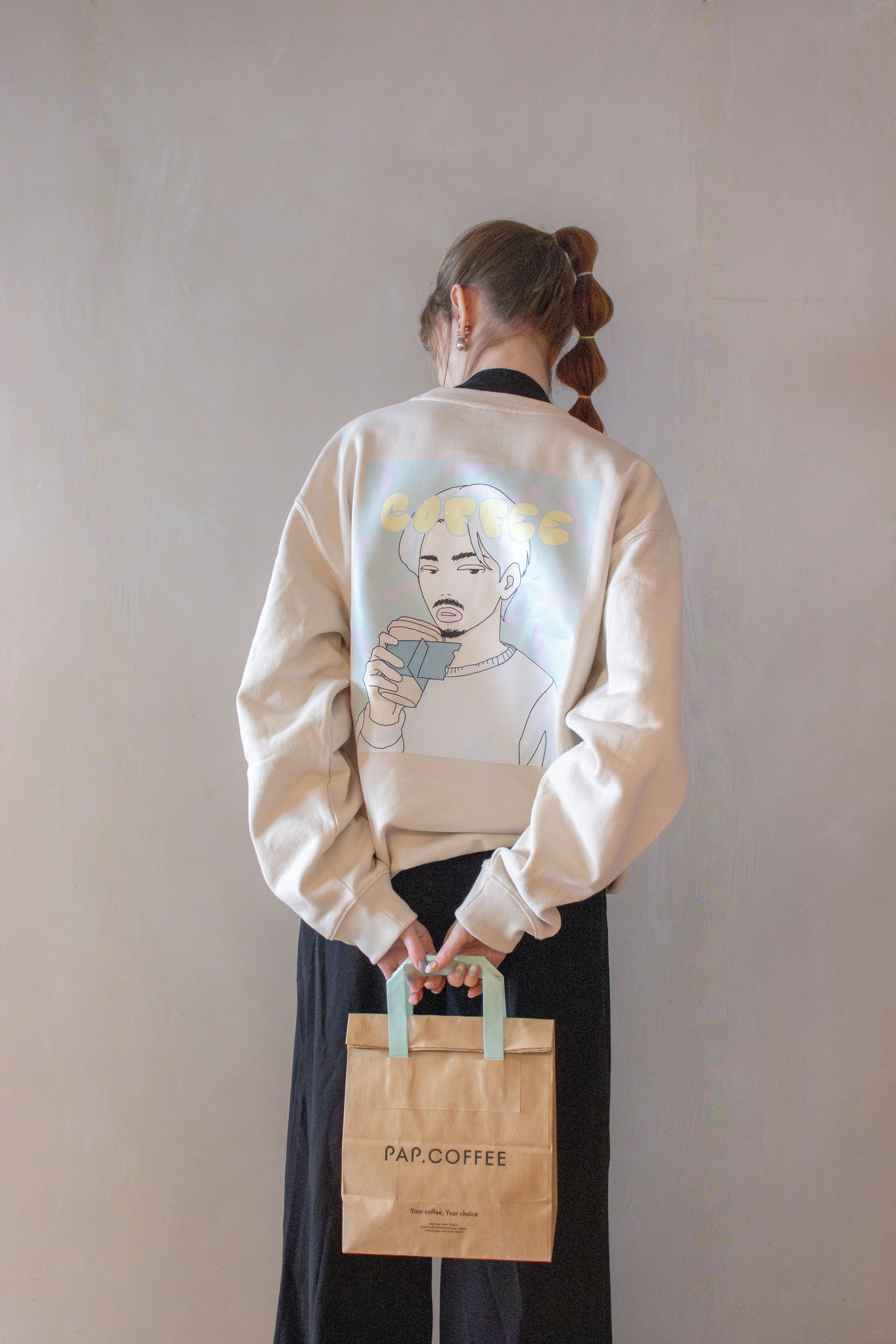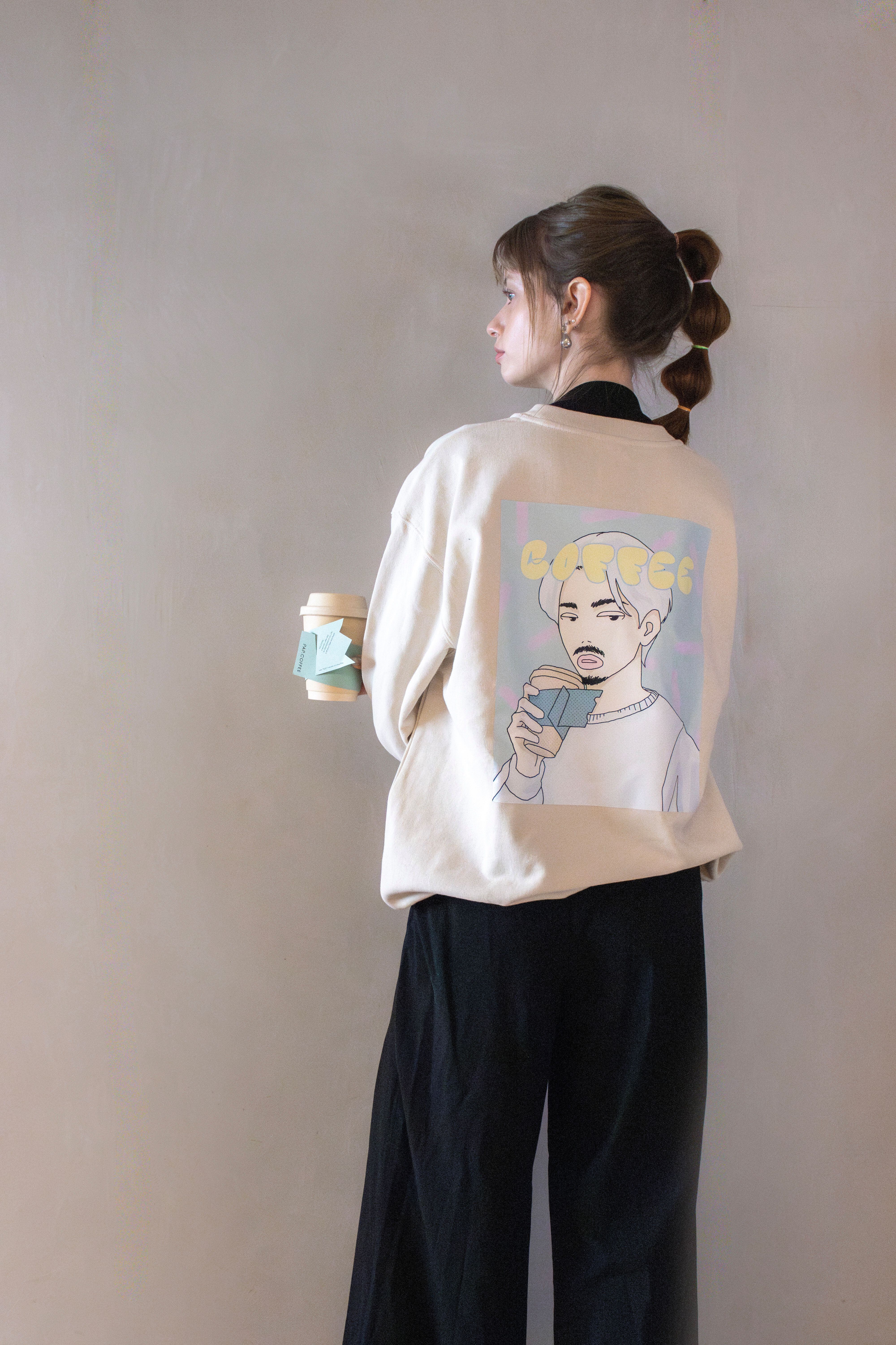 特徴:PAP.COFFEEのカップスリーブがついた紙コップを持つキャラクターデザインが施された、原宿らしいストリートカルチャーを感じるスウェット